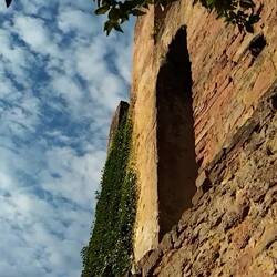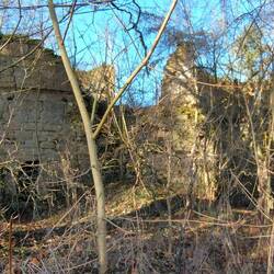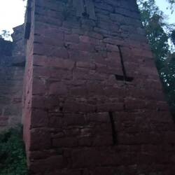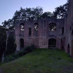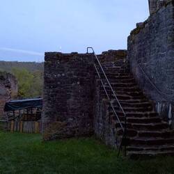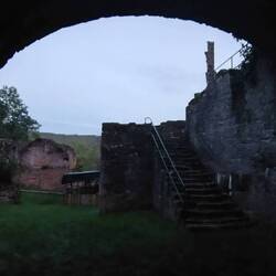 Die Dämmerung zieht bereits herauf. Eher hastig durchschreite ich das Gelände, finde ein Gewölbe und trete ein. Zehn, zwölf Meter zieht sich der hohe Keller unter der Burg hindurch zu einem schmalen Ausgang hin. Ich entdecke einen Kamin und - einen Treppenabgang tiefer hinab. Weit kann ich nicht sehen, doch hier will ich nicht bleiben. Gru-se-lig!