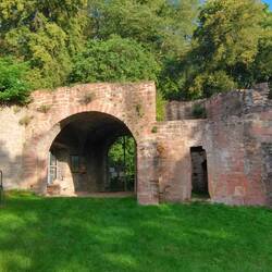 Immer dem Graben folgend, stieß ich auf einen Torbogen, der einen niedrigen Tunnel begrenzte, der durch die Aufschüttungen hindurch führte. Auf der anderen Seite lagen die verschütteten und überwachsen Reste der Burg Hohenlandsberg. Jetzt konnte ich auch Zugänge zu den Gewölben und Kasematten entdecken.