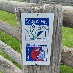 Nach einer kurzen Anreise mit zwei Umstiegen und doppelter Fahrkarte, starte ich gegen 18:30 auf den Fränkischen Marienweg. Der Weg ist insgesamt erwa 1340 Kilometer lang und zieht sich in ungezählten Schleifen und Windungen durch das altfränkische Land, von einem heiligen Marienort zum nächsten. Natürlich kann ich den ganzen Weg nicht auf einmal gehen, sondern will ihn immer dann ein Stück wandern, wenn es sich ergibt. Er bietet sich dazu einfach an, weil er sich quasi um meine Haustür herum ausbreitet.