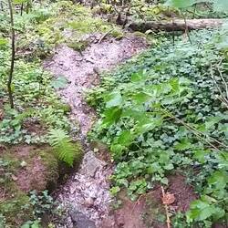 Auch heute trat ich die meiste Zeit auf Asphalt, was bei der Hitze richtig anstrengend gewesen ist. Nur zweimal ging ich durch etwas Wald, erfrischend kühl, und entdeckte dort den alten Landwehrgraben Würzburgs. Bislang hatte ich keine Ahnung davon, dass Würzburg einen hatte: