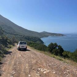 Es wird steiniger, ruckeliger, schmaler, und irgendwann müssen wir uns eingestehen: es ist nicht mehr viel übrig von ‚Straße‘, es ist mittlerweile eher ein Wanderweg. Ein harter Schlag ist zu spüren, als wir über einen Stein stolpern, der im Gras versteckt lag, und wir halten schließlich doch an (der Kaffee war mittlerweile auch überall verteilt!).