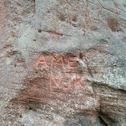Hier gibt es sehr viel Sandstein, und an vielen Stellen ist zu sehen, wie die Felsen sich verändern, große Teile abbrechen, Sandhäufchen darunter liegen, aber an der Felswand ist auch zu sehen, dass so gut wie jeder sich hier im weichen Fels zu verewigen scheint, denn es ist kaum eine Stelle zu finden, an der nichts eingraviert ist.