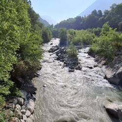 Een korte etappe van 16 km was tegen de middag al achter de kiezen. Alweer vol variatie. Ik starte met een stukje langs de rivier Dora Baltea. Ik herinnerde me nog hoe smal het stroompje was toen we nog hoog tussen de sneeuwvelden zaten. Nu is het een soort Schelde maar die vele malen sneller stroomt en groen ziet van de mineralen. De temperatuur gaat weer naar de 30 toe en rondom me wordt het oervloedige water rond gespoten door sproeiers. Ik hoopte steeds op een spontane douche.