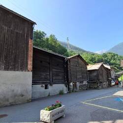 Ik drink een koffie onder een parasol in Massongex. Het doet wat Provençaals aan, maar daar zit het weer voor veel tussen. Twee oudere dames spreken me aan in het Frans met Zwitsers haar op. Ze herkennen het logo op mijn rugzak. Waar ik vertrok? Lausanne. O, dan ben je nog maar net vertrokken. Ze wensen me 'bonne route'. De reeds afgelegde 63km zijn dus allemaal maar 'net begonnen'. Ik voel me wat miskend want ik voel de stramheid in mijn benen. Maar eigenlijk moet ik ruiterlijk toegeven dat ze gelijk hebben. Zo klein als ik me voel tussen de mastodonten, zo klein de al geleverde inspanning. Het is middag en de helft van mijn traject voor vandaag zit er al op. Koffie leeg. Ik laat ook dit dorp achter me.
