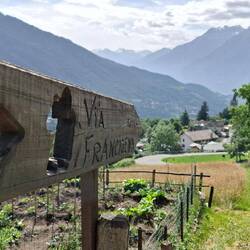 Deze ochtend hebben we dan de grote afdaling ingezet. Ik hield het bij 14 kilometer, en een verval van meer dan 1250 meter afdalen. Om mijn knieën te sparen. Dat was de redenering toen ik nog thuis was. Mijn Ierse vrienden heb ik vaarwel gezegd. Zij lopen in één dag door tot in Aosta. En daarmee zijn we dus defintief in Italie aanbeland. De sfeer is meteen een stuk gemoedelijker, de dorpjes wat rommeliger, maar de Via Francigena is plots overal. In elk dorpje zie je pancartes, en zie je bordjes waar je je stempel kan halen.