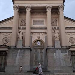 Ondertussen passeerde ik Roppolo (een wijndomein) maar vooral Cavaglià. Wat zich aandiende als een eenvoudig dorp van nog geen 3500 inwoners bleek een kerk te hebben die eerder past bij een stad van 10 keer zo groot. De octogonale koepel zag ik al van ver. Het is zondag en de kerken zijn dus open. Toen ik die kerk binnenstapte kwam ik adem te kort. De vormen, kleuren, frescos's, zuilen. Wat een weelde. Hier richt je je blik als vanzelf naar de hemel. Hetzelfde herhaalde zich nog een keer in mijn dagbestemming Santhià. De viering zal hier nog niet zo lang achter de rug geweest zijn. De geur en de waas van wierrook hing nog centraal in het indrukwekkende schip. De Italianen en religieuze architectuur, veel beter wordt het niet.