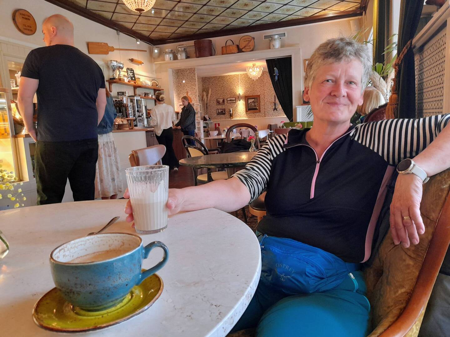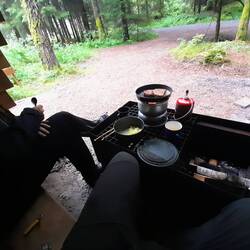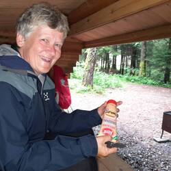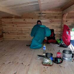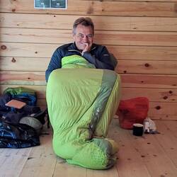 Wegen Regen genossen wir in Varberg noch ein feines Cafe bevor wir zum nächsten Shelter wanderten. Da kommen auch unsere Stüehli voll zum Zug, warm eingepackt im Schlafsack.