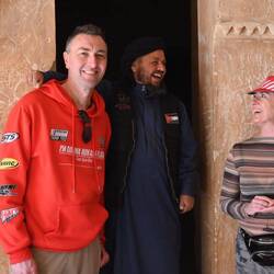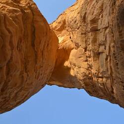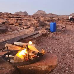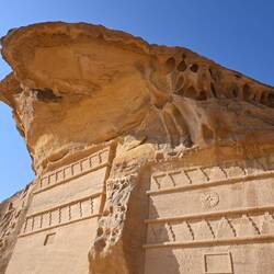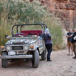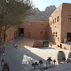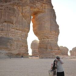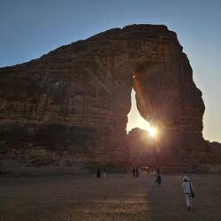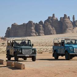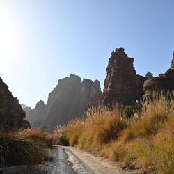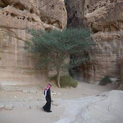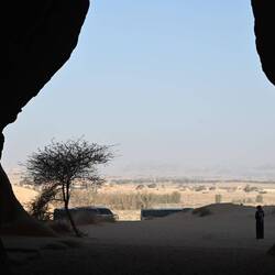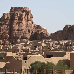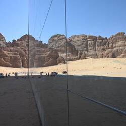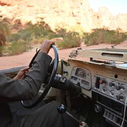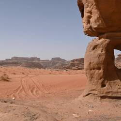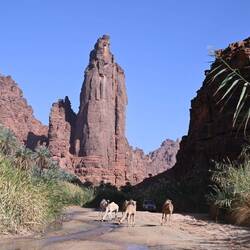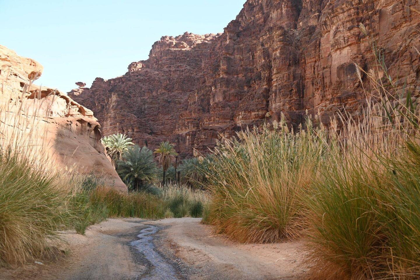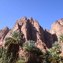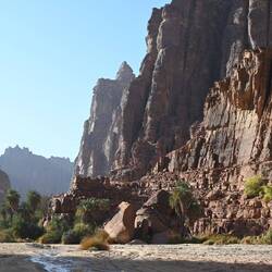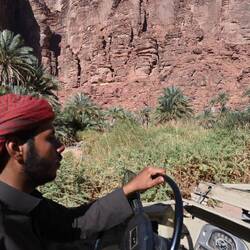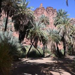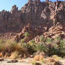 Nach vielen Kilometern durch diverse Beige- und Ockertöne der Wüste wechselt plötzlich das Farbenspiel der Natur. Im Wadi Al-Disah ("Tal der Palmen") überragen imposante, rote SandsteinklippenRead more