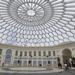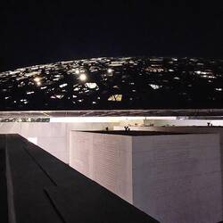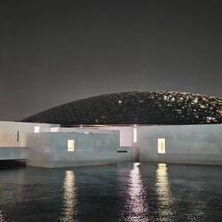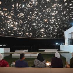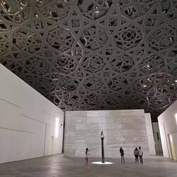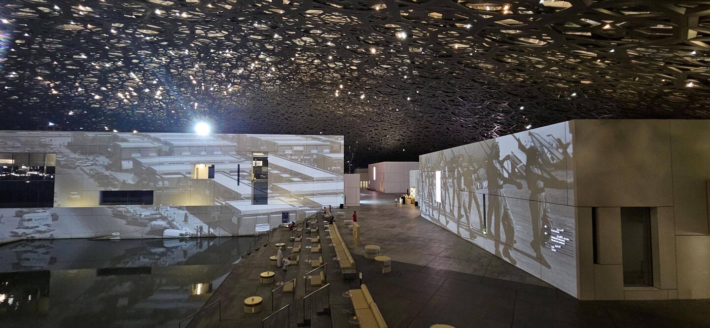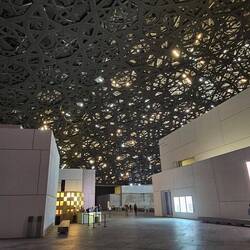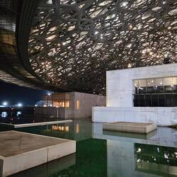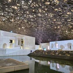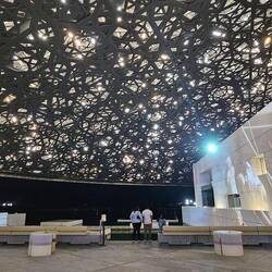 Nummer vier im weitläufigen, nachts bunt illuminierten Museumspark ist der Louvre. Nein, wir haben uns ob des kriegsbedingt phasenweise gestörten GPS-Signals nicht massiv verfahren. Auch Abu Dhabi hat seit knapp zehn Jahren ein Kunstmuseum diesen Namens - und es verschlägt einem die Sprache. Wie ein Ufo schwebt ein kuppelförmiges, 7500 Tonnen schweres Dach mit 180 Metern Durchmesser auf einem Komplex aus verschachtelten Quadern und entfaltet im Inneren eine Atmosphäre, die ihresgleichen sucht: Leicht und offen trotz seiner gewaltigen Größe. Zum Niederknien schön!