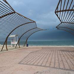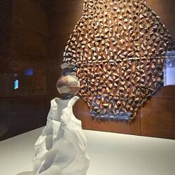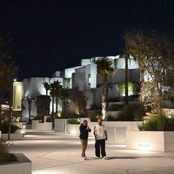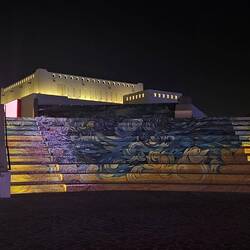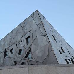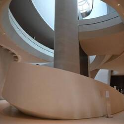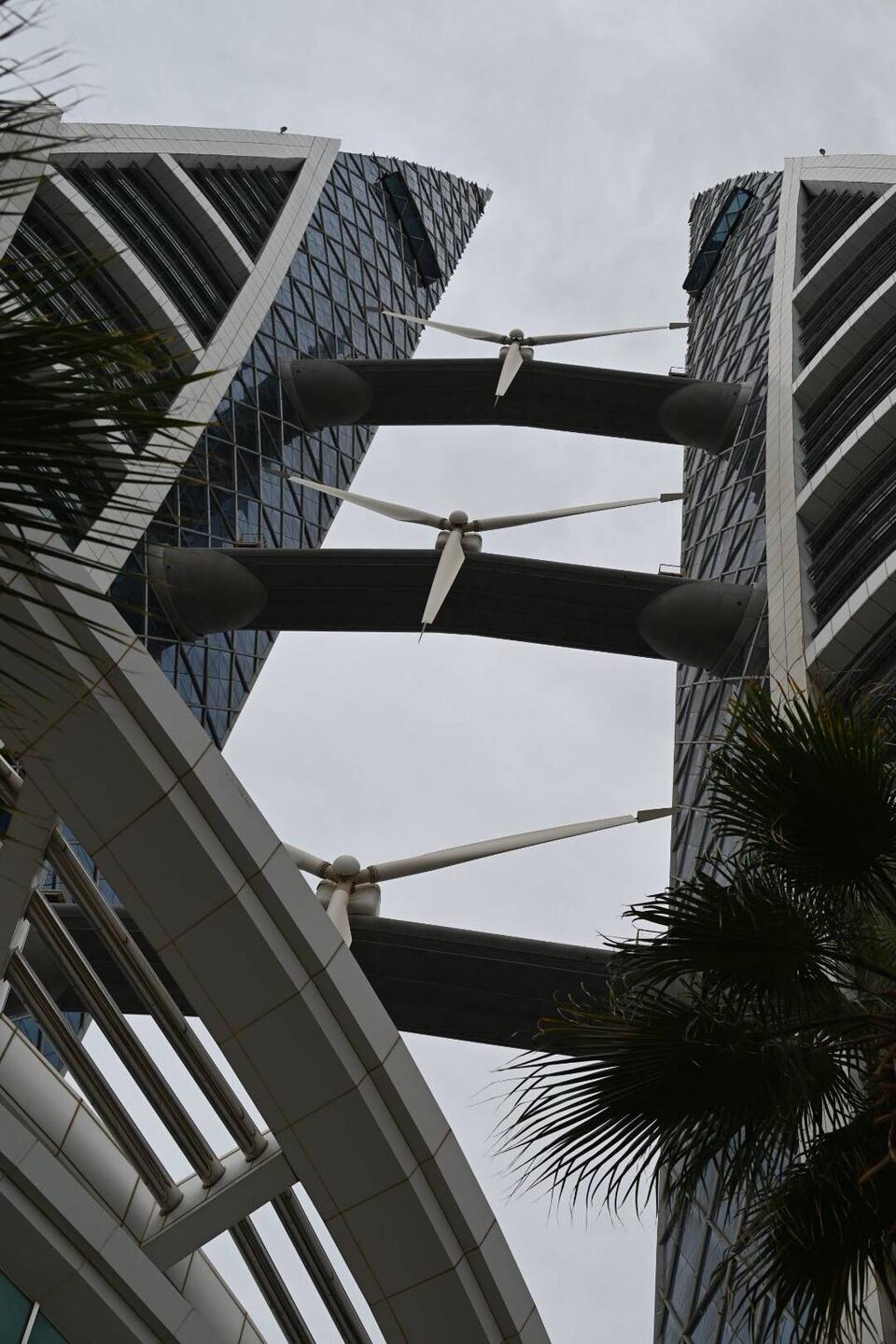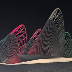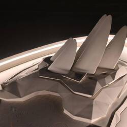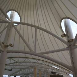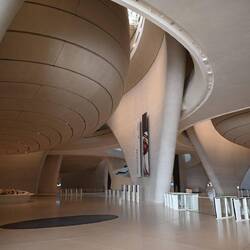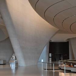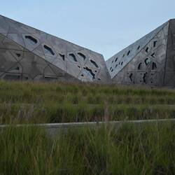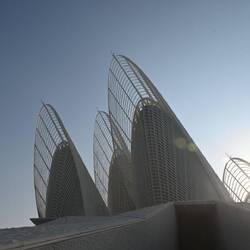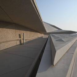Diese Flügel aus Leichtstahl sind Teil eines natürlichen Belüftungssystems. Öffnungen an der Spitze dieser Türme nutzen den Unterdruck auf der Lee-Seite des Segelprofiles. So saugen sie warme Luft aus dem Atrium des Museums. Der thermische Effekt, dass sich die Flügelspitzen erhitzen, verstärkt die Wirkung. Luft, die in Röhren tief im Wüstenboden unter dem Gebäude auf natürlichem Weg gekühlt wird, strömt in das Museum.