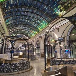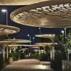 Wenn man nachts daran vorbei fährt, dann vermitteln die geschickt in der aus 400.000 Einzelteilen montierten Kuppel verteilten Lampen den Eindruck funkelnder Sterne. Tagsüber lässt die gewölbte Decke Sonnenlicht durch und schafft im Inneren einen "Regen des Lichts". Aus acht Schichten Edelstahl und Aluminium ist das Ufo zusammengesetzt.