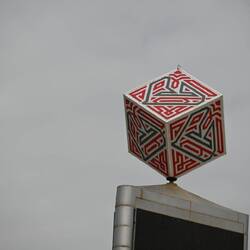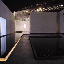 Weiter geht es durch Tunnels, durch die einen Strudel aus Licht zu spülen scheinen. In einem roten Rondell schwebt eine schwarze Scheibe, faszinierend und bedrohlich zugleich. Jede Bewegung im Raum lässt das 200 Kilo schwere Stoffrund, das nur von Luftströmen getragen wird, von seinem Kurs abweichen. Majestätisch.