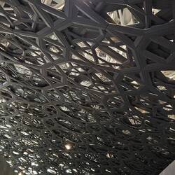 Wie ein riesiger, flacher Suppenteller, der umgedreht auf dem Tisch liegt, wirkt das schwarze Dach des Louvre Abu Dhabi. Das heißt - eigentlich liegt er gar nicht. Das 7500 Tonnen schwere Stahlkonstrukt scheint zu schweben, denn es wird so geschickt von nur vier in weißen Gebäudeklötzen versteckten Säulen getragen, dass es kaum wahrnehmbar ist. So bekommt ein riesiges Bauwerk mit 180 Metern Durchmesser eine ungeahnte Leichtigkeit.