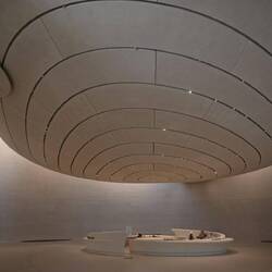 Die Museumsräume sind in eine Art Hügel eingebettet, der die Topografie der Emirate abstrahiert. Das verwendete Material reflektiert die unterschiedlichen Sandfarben in den sieben Staaten der Emirate.
