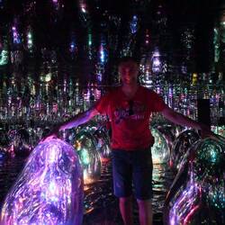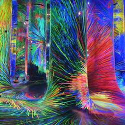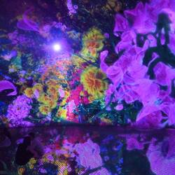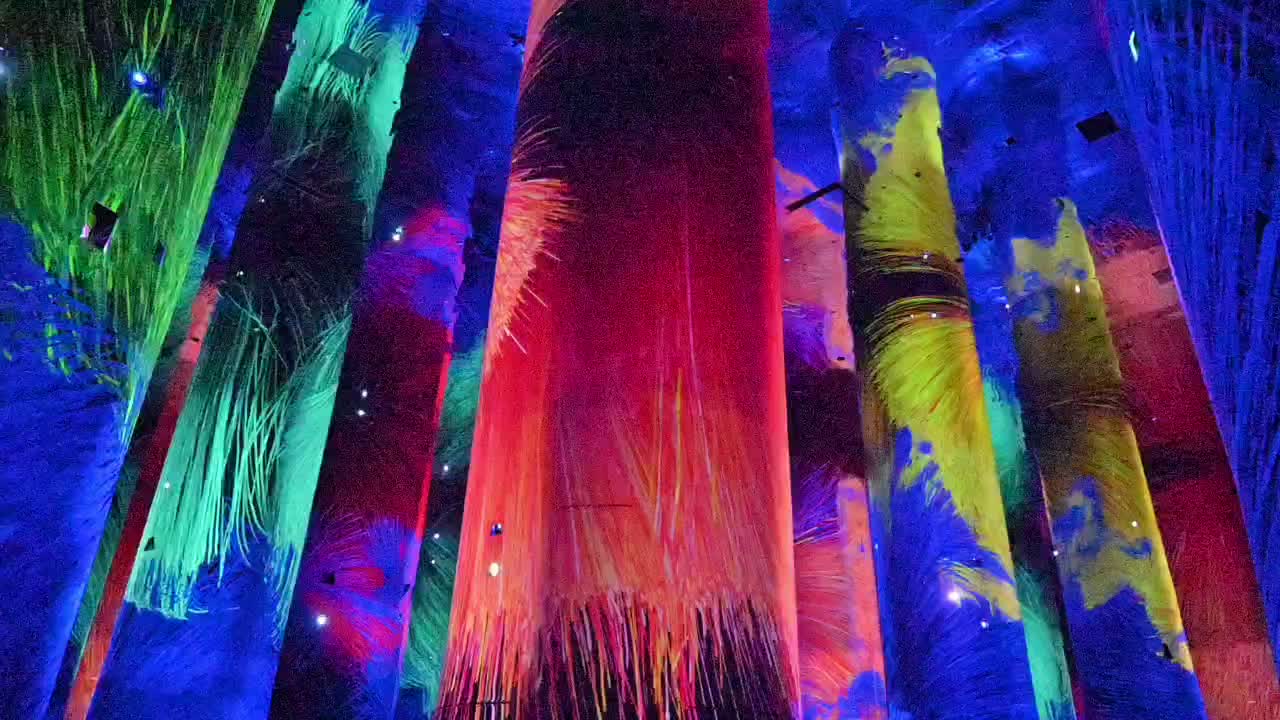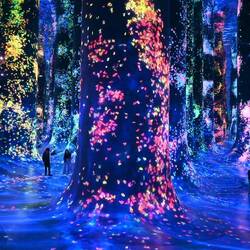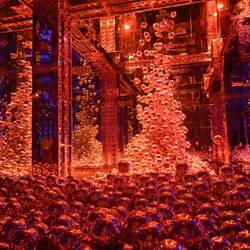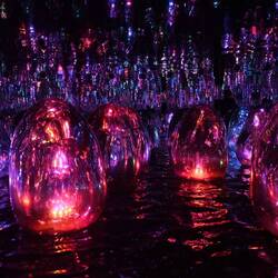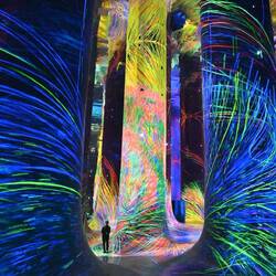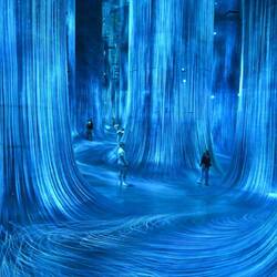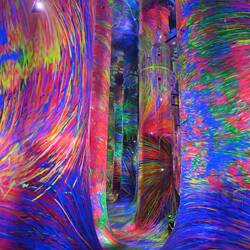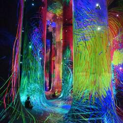 Durch ein nahezu lichtloses Labyrinth schwarzer Gänge geht es von Installation zu Installation. Schon der Auftakt raubt einem den Atem und führt unweigerlich zur Ausschüttung einer satten Dosis Glückshormone: In einem kunterbunten Zauberwald fließen Farben gewaltige Baumsäulen hinauf und hinab. Spiegel verleihen dem imaginären Multicolor-Forst den Eindruck unendlicher Weite. Müsste man das Paradies entwerfen - so würde man es vermutlich gestalten.