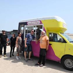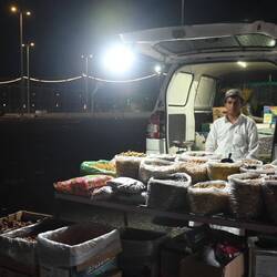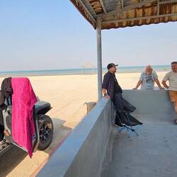 Wie so oft sitze ich noch ein wenig und genieße den lauen Abend am Meer, während der Rest vom Team schon schläft. Und wie so oft, wenn wir an öffentlichen Plätzen campieren, kommen immer wieder Einheimische vorbei, fragen, plaudern, filmen, bieten Hilfe an. Die Weltkarte mit unserer Route auf der Motorhaube ist stets der Einstieg ins Gespräch. Was, so weit seid Ihr gefahren? Mashallah!