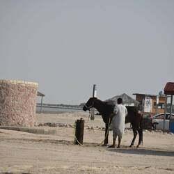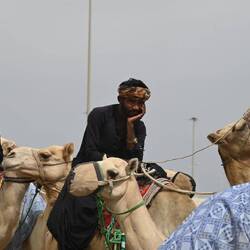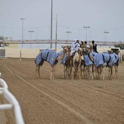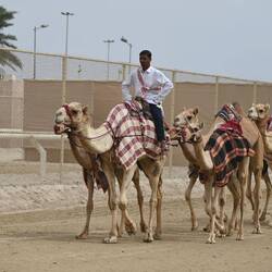 Einen Wettlauf zu beobachten ist uns zwar nicht vergönnt. Aber zu sehen sind Dutzende Teams, die ihre Tiere auf einen der zahlreichen Rundkurse zum Training bringen. Vom Kalb oder Fohlen (beide Begriffe werden für Jungtiere verwendet) bis zum fertig ausgebildeten Rennkamel führen die Trainer teils ganze Ställe mit.