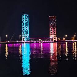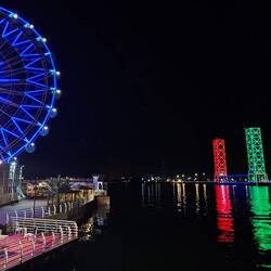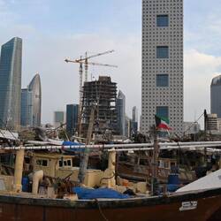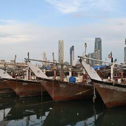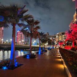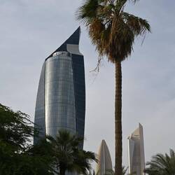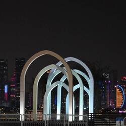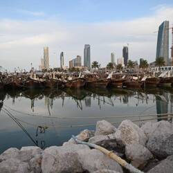 Nach lecker Fleischspießen zum Abendessen schlendern wir am von Skulpturen gesäumten Corniche, der Strandpromenade, gemütlich und kilometerweit Richtung Downtown und ergötzen uns dabei an der bunt beleuchteten Skyline, bis die Füße schmerzen und Uber übernimmt. In der Bucht vor den Riesen aus Glas, Beton und Stahl dümpeln dutzende Daus, die traditionellen Holzschiffe.