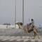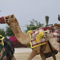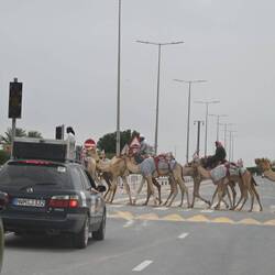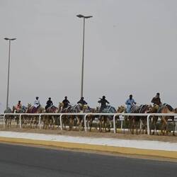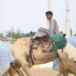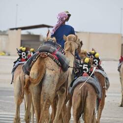 Entweder sitzen zierliche Jockeys im Sattel, das heißt sie klammern sich hinten an den Höcker. Oder ein merkwürdiges, kleines Paket ist auf den Rücken des Renntieres geschnallt: Ein Automat, mit dem man dem bedauernswerten Wettbewerber ferngesteuert Peitschenhiebe erteilen kann. Dazu fahren die Eigentümer im Auto neben der top-gepflegten, kilometerlangen Sandbahn her. Die sechs bis 15 Kilo schweren Automaten, die per Lautsprecher Kommandos der Trainer übermitteln, ersetzen die Kinder, die früher als Jockeys im Einsatz waren. Die Roboter tragen oft Trikots und Hüte; sie werden manchmal parfümiert, um von den Kamelen akzeptiert zu werden.