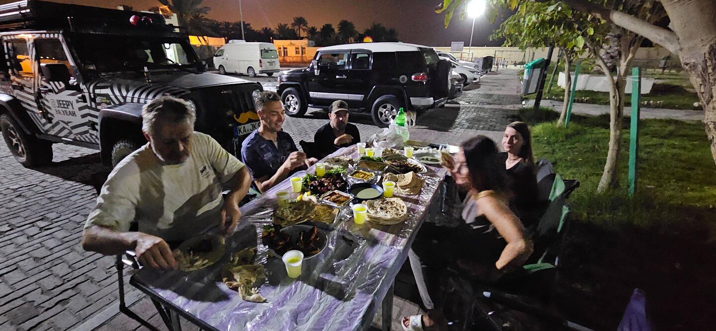 In Salwa verbringen wir einmal mehr eine geruhsame Nacht an einem prächtigen Strand mit all der Infrastruktur, die Wildcampers Herz begehrt. Wir treffen dort Weltenbummler aus England und Karlsruhe. Christian und Alina, "Jeep_ya_yeah", schließen sich uns spontan an und begleiten uns nach Katar. Die beiden sind schon seit fast drei Jahren zusammen unterwegs. Immer wieder eine Bereicherung, andere Overlander zu treffen.Læs mere