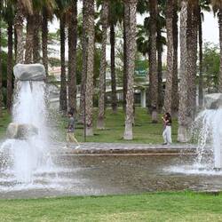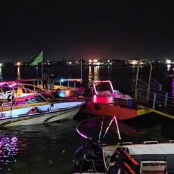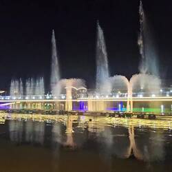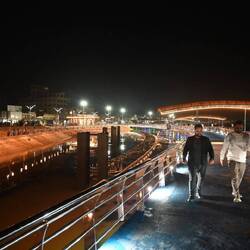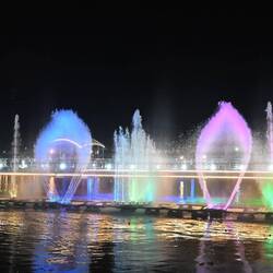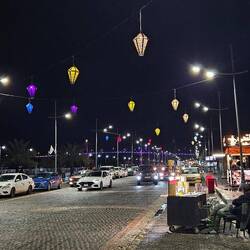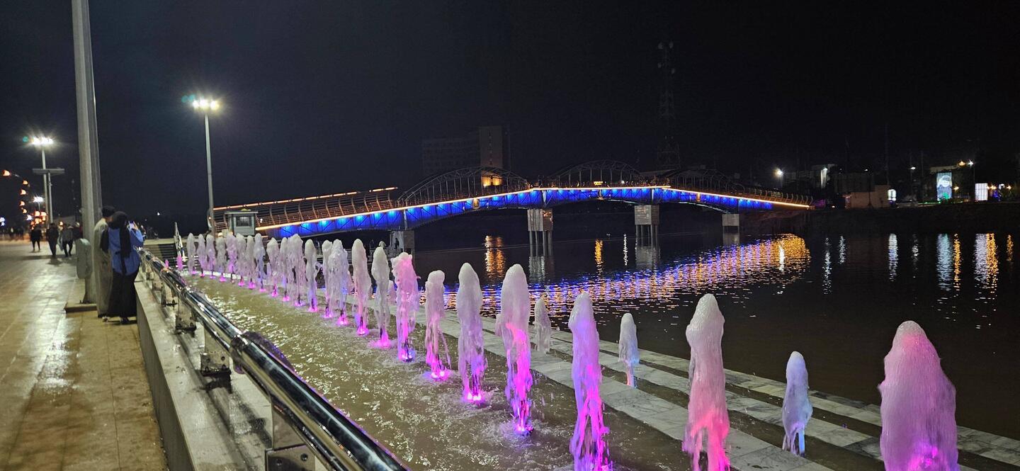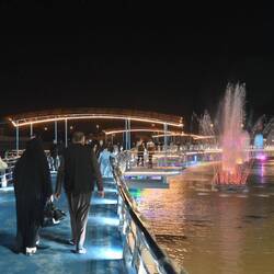 Wer nun glaubt, ein solch seltener Regenguss brächte das öffentliche Leben temporär zum Erliegen, irrt. Kaum ist's vorbei, gehen die Menschen wieder ihrer Lieblingsbeschäftigung nach: Dem abendlichen Flanieren. In Amara, einem unspektakulären Städtchen im Zweistromland nicht weit vom Zusammenfluss von Euphrat und Tigris, hat man dazu sogar einen halbmondförmigen Steg auf den Fluß gebaut, um die Uferpromenade aufzumotzen. Damit nicht genug: Am späteren Abend steigt dort eine veritable Licht-, Wasser- und Musikshow. Dutzende Fontänen tanzen, bunt beleuchtet, zu arabischen und internationalen Klängen. Selbst die Titanic-Untergangshymne ist dabei. Irgendwie passt sie.
