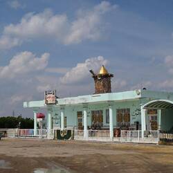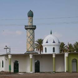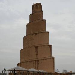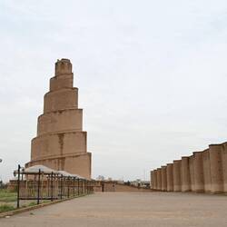 Die große Moschee im kleinen, recht elend anmutenden Ort Samarra ist etwas ganz Besonderes. Sie erhielt ein spiralförmiges Minarett, das einer altmesopotamischen Zikkurat ähnelt. Der weithin sichtbare Turm mit seiner geländerlosen Außentreppe ist ebenso imposant wie das trutzige Karree, das die Moschee umgibt. Doch das gesamte Areal ist, warum auch immer, abgeriegelt. Ein freundlicher Wachmann lässt uns zum fotografieren wenigsten ein paar Schritte durchs verschlossene Eingangstor. Mehr geht nicht.