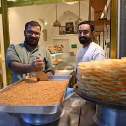 Im Lauf des Abends füllen sich die Gassen und Restaurants. In einem Straßencafè werden wir beim Karak (Tee mit Milch) Zeuge eines Altherrentreffens an den Nebentischen - Stammtisch gibt's hier also auch. Man erscheint, klassisch-gediegen, ganz in Weiß.