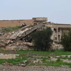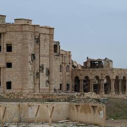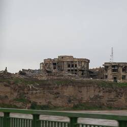 In Tikrit, einer Stadt am Tigris, interessiert uns vor allem die alte Zitadelle hoch über dem Fluss. Als wir von der Hauptstraße gen Norden in den Ort abbiegen, fallen uns ein paar mächtige, verfallene Gebäude auf. Neugierig fahren wir in ihre Richtung. Schnell wird klar: Hier wurde bombardiert. Aber was?