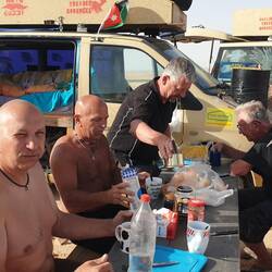 Frühstück in der Wagenburg nach einer Nacht, in der erstaunlich viel gesägt wurde, obwohl weit und breit kein Baum steht.