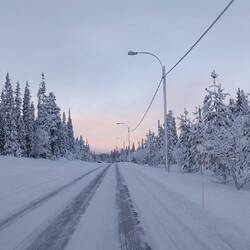 Weiter geht’s. Unser Tagesziel ist Saariselkä (auch ein Tipp von Andreas) ein Aussichtspunkt mit Rundumblick. Klingt einfach, oder? Doch erst einmal heisst es, die Vorräte auffüllen. Der kleine Supermarkt liefert alles Nötige – und das unnötige Zeug, das uns in solchen Momenten immer besonders verlockt. Gut eingedeckt starten wir den nächsten Akt: Den eisigen Anstieg auf den Berg.