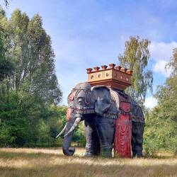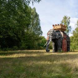 Danach ein Abstecher zu den alten Kohleminen. Schwarz, schwer, Geschichte zum Anfassen. Und dann, mitten im Wald, steht er plötzlich: ein Elefant. Kein lebendiger, sondern ein Elefant aus Stahl und Erinnerung. Riesig, mächtig, aber zugleich seltsam still. In seinem Bauch – ein kleiner Kinosaal, ein Herz voller Bilder. Der „Elefant des Gedächtnisses“ nennen sie ihn.