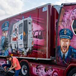 Die Rennen: wild, laut, spektakulär. Schon beim ersten Lauf schaffen es vier Trucks nicht heil ins Ziel. Tonnen von Blech fliegen durch die Kurven, als wären’s Spielzeugautos. Die Streckenposten rennen im Dauereinsatz mit Ersatzpfosten, das Publikum jubelt, die Motoren dröhnen, Diesel liegt in der Luft. Dazwischen Hamburger, Fanshops und kunstvoll bemalte Trucks – wir mittendrin in dieser speziellen Renn-Atmosphäre.