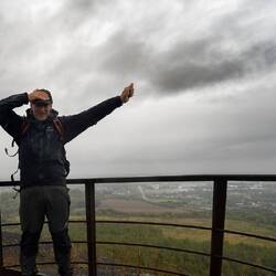 Auf einem Parkplatz finden wir ein gutes Plätzchen, um mit Knutschi zu übernachten. Aber ein Hügel ruft – also Schuhe an, Kapuze tief ins Gesicht und los geht’s zu Fuß. Regen peitscht uns ins Gesicht, Wind zerrt an der Jacke, der Boden ist matschig – trotzdem stapfen wir den Hügel hinauf. Oben angekommen, nass bis auf die Knochen, aber die Aussicht entschädigt.
