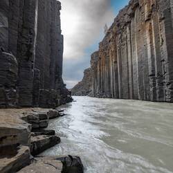 Danach passieren wir Egilsstadir im Schnellzugstempo, denn wir wollen noch den Stuðlagil Canyon besichtigen. Als wir vor vier Wochen auf Island ankamen, wussten wir von diesem Canyon noch nichts, darum müssen wir das nun noch nachholen. Aber es sind ja nur 70km Umweg und wir haben genug Diesel… Allerdings haben wir nicht wirklich viele Infos gefunden und wissen nicht so recht, wie die Zufahrt mit unserem Womo ist. Beim anvisierten Parkplatz vor der Brücke stellen wir unser Knutschi ab und laufen ab da. Es ist der richtige Entscheid, zwar kommt 2km später der richtige Parkplatz, aber die Strasse bis dahin ist ziemlich schlecht. So laufen wir, während all die Touristen in den gemieteten Autos in die Löcher fahren und die Stossdämpfer strapazieren. Nach dem Parkplatz geht es nochmals etwa 400m bis zum Stuðlafoss, der nicht wie erwartet in den Canyon fällt, sondern ausser dem Namen gar nix mit dem Canyon zu tun hat. Der Wasserfall sieht aber heute spektakulär aus, da oben die Gischt an den 6-eckigen Felsen gefroren ist und weiss schimmert.