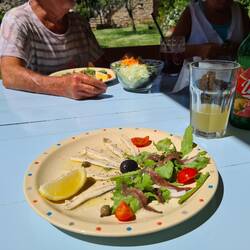 Nach der ganzen Aufregung am Morgen ruhen wir uns erst einmal aus. Aber gegen Nachmittag mache ich dann zusammen mit Krügers eine Radtour ins Naturschutzgebiet Palud. Wir wollen zur Agroturizam Mofardin, einer Art Bauerngasthof. Dort waren Heidi und Hans Werner mit Bekannten schon einmal. Über Schotterstraßen fahren wir zum "Camping Vešta" und schauen uns die Anlage an. Auch an dem Mini Camp "Mon Paradiso" kommen wir vorbei, der mitten im Nirgendwo liegt. Ein sehr idyllischer Platz, aber nur etwas für Vans oder Bullis. Dann kommen wir zu dem Agroturizam. Übersetzt Agrotourismus, was soviel wie "Gastronomie auf dem Bauernhof" bedeutet. Der "Agroturizam Mofardin" ist wirklich ein ganz hübsches kleines Restaurant. NO STRESS" - ist das Moto des Mofardin-Hauses und wird von der Landschaft im Naturschutzgebiet Palud unterstrichen, die das alte Steinhaus umgibt, das nur wenige Schritte vom Meer entfernt ist. Die Trattoria Mofardin serviert typisch istrische Speisen. Mit viel Liebe sind verschiedene Sitzecken in einer Laube und unter einem Baum geschaffen worden. In einer Scheune steht ein großer Holzofen auf dem gegrillt, gebraten und in der traditionellen „Peka“ gekocht wird. In Kroatien heißen Mahlzeiten, die nach „peka“-Stil zubereitet werden, „ispod peke“, „unter einem Deckel gekocht. Peka“ bezieht sich aber auf den gesamten Topf, der aus einem großen Metallgeschirr mit einem gusseisernen Deckel besteht. Im Topf mit dem Deckel wird über einem offenen Feuerplatz gekocht. Üblicherweise dauert es einige Stunden, bis die Mahlzeit fertig zum Servieren ist. Wir bestellen eine Sardellenplatte. Zwei verschiedene Arten von Sardellen werden mit Rucola, Kapern, Tomaten und reichlich Olivenöl serviert. Dazu gibt es das leckere Weißbrot. Ein wirklich schmackhafter Imbiss. Und dann lerne ich auch noch " Miš Maš (Mischmasch ausgesprochen) kennen. Fanta mit Rotwein, das hier in der Gegend überall serviert wird.