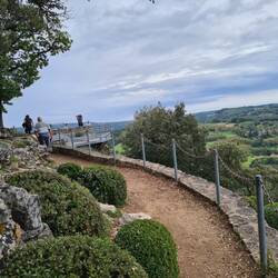 Insgesamt 6 km umfasst der Weg durch den Park. Damit haben wir nicht unbedingt gerechnet. Auch nicht, dass es zum Belvédère kontinuierlich bergauf geht. Vom Aussichtspunkt "Belvédère de la Dordogne", 130 Meter über dem Fluß gelegen, eröffnet sich ein schönes Panorama auf das Tal, die Schlösser, die Dörfer und auf die Dordogne. Für die frei über dem Tal schwebende Plattform sollte man schwindelfrei sein. Michael schaut sich das Ganze lieber aus sicherer Entfernung an.