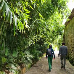 Es geht, wie soll es auch anders sein, wieder bergauf, bis wir den Roller unterhalb der malerischen Gärten parken können. Die Gärten liegen auf einem Felsvorsprung und der 22 ha große Park überragt das Tal. Darum spricht man auch von den hängenden Gärten, in deren Mittelpunkt ein Schloss aus dem 19. Jahrhundert steht. 150.000 Buxbäume, in fantasievolle Formen mit wallenden Bewegungen und in Rundungen geschnitten, werden hier in Szene gesetzt (bisher hat der Buchsbaumzünsler den Weg hier noch nicht hingefunden).