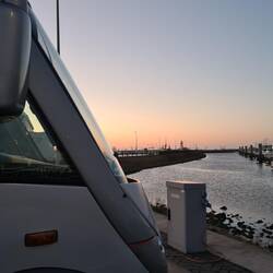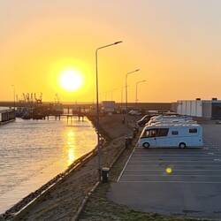 Aufgewärmt und etwas ausgeruht, geht es später noch einmal auf dieselbe Tour. Dieses Mal allerdings in Begleitung . War es die Sonne, meine begeisternde Erzählung oder die Möglichkeit, unterwegs frische Kibbeling zu bekommen, die sich als Motivator auswirkten ? Egal, Michael begleitet mich dieses Mal und im Schein der tief stehenden Sonne erscheinen die Ecken und Winkel der Stadt in einem ganz besonderen, geheimnisvollen Licht. Wir finden einen Stand mit Kibbelingen, die wir sofort auf der Hand essen. Das Abendessen kann ausfallen . Gut gesättigt geht es zurück zum Wohnmobil, während die untergehenden Sonne den Hafen und das Wasser verzaubert. Das war doch schon mal ein echtes Highlight heute, denke ich und schaue aus dem Womofenster dem Verkehr auf der Brücke und dem auf der Fahrrinne zu. Es hupt durchdringend. Die beleuchtete Fähre läuft aus. Welch ein Anblick am Abend!Read more