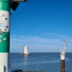 Die nächste Enttäuschung folgt auf dem Fuß: Ich kann den Deich sehen, aber dazwischen liegt mal wieder Wasser. Also alles auf Anfang und zurück. Es ist dann doch ein gutes Stück zu laufen, um auf die andere Seite des Hafens zu gelangen. In einem Fischresraurant in der Nähe des Hafens sitzen die Gäste schon bei Kibbelingen und Bratfisch auf der Terrasse in der Sonne.