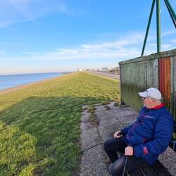 Für mich geht es so langsam zurück zum Womo. Da unser Mobil direkt im Wind steht, ist das heute nichts mit Sitzen in der Sonne. Aber dann finde ich eine windgeschützte Ecke hinter der geschlossenen Kibbelingbude und kann mich von der Sonne im Liegestuhl etwas verwöhnen lassen.