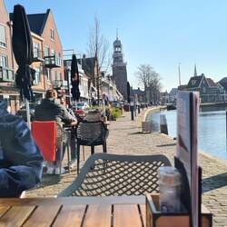 Wie gewöhnlich, mach ich mich kurz nach unserer Ankunft fertig, um die Gegend zu besichtigen. Die Sonne scheint zwar vom wolkenlosen Himmel, aber der Wind ist ziemlich kalt. Ich laufe gleich hinter dem Restaurant "Havenzicht" , das eine schöne, windgeschützte Terrasse hat, aber noch nicht nicht geöffnet hat, am Hafenbecken entlang.