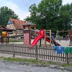 Heute Morgen ist das Aufstehen nicht so chaotisch. Wir haben einen Plan. Und so macht es auch nichts, dass wir eigentlich verschlafen haben. Die Reitaktivitäten beginnen um 9.30 Uhr, das bedeutet spätestens um 9.00 Uhr fertig mit dem Frühstück zu sein. Wir werden um 8.30 Uhr wach. Aber wie gesagt, wir haben einen Plan, und während ich Brötchen besorge, Clara sich anzieht, deckt Michael schon mal draußen den Tisch. Beim Ponyreiten muss nicht zwingend jemand dabei sein und so können wir, als Clara geht, noch in Ruhe zu Ende frühstücken. Opa Michael geht danach in die Reithalle, um großelterliche Präsenz zu zeigen, während ich für die anfallende Hausarbeit zurück bleibe. Für heute stehen noch Voltigieren und Bogenschießen auf Claras Plan. Ich dagegen muss nach 2 Tagen "Lagerleben" einfach mal raus. Überall Kinder und Ponys. Mit dem Rad will ich nach Liebenau. Eigentlich nicht weit, aber an der Landstraße dorthin gibt es keinen Radweg. Ich möchte herausfinden, ob es noch einen anderen Weg gibt, um evtl. einmal mit Clara zusammen dorthin zu fahren. Im Garten eines Hauses am Ortsausgang arbeitet eine ältere Frau, die ich darauf anspreche. Sie weist auf einem Weg, der oberhalb der Landstraße über den Berg führt. Aber für Kinder wäre der nichts, sagt sie. Viel zu steil. Sie selbst fährt immer Landstraße. Das ist zwar weiter, aber angenehmer. Dann erzählt sie mir noch von ihren Kindern und Enkelkindern und ich habe Mühe dem Redefluss zu entgehen, um meinen Weg fortzusetzen. Es geht zunächst steil berghoch bis in eine Siedlung, und dann führt ein asphaltierten Weg über den Berg. Die Frau hat Recht, die zweite Steigung ist so steil, dass selbst mein Ebike es nicht schafft. Ich habe meine liebe Mühe, das Rad zu halten und nicht mit ihm umzukippen. Hinter mir höre ich zwei Radwanderer schnaufen. Sie hängen viel weiter unter mir fest und kommen keinen Meter mehr weiter. Es hilft nichts, ich muss den restlichen Weg hinauf schieben. Da ist die Schiebehilfe am Rad eine wirkliche Unterstützung. Dann geht es nur noch steil bergab, dass die Bremse ordentlich gefordert wird, bis mitten in den Ort Liebenau hinein. Nein, das ist wahrlich kein Radweg für Kinder. Viel zu gefährlich! Auch ich werde auf dem Rückweg lieber die Landstraße nehmen. Aber zunächst will ich mir Liebenau anschauen. Das ist schnell gemacht. Eine Kirche, eine Handvoll Fachwerkhäuser und ein Tante Emma Laden. Hier bekomme ich Kuchen für den Nachmittag. Einladend sieht der Biergarten an dem kleinen Fluß Warme am Ortseingang aus. Leider ist er verwaist. Niemand ist dort anzutreffen. Ich fahre auf der Landstraße, die im übrigen auch ihre Steigungen hat, zurück und schaue mir noch das beheizte Freibad an, das ganz idyllisch gegenüber des Ponyhofes am Berg liegt. Das Freibad hat erst morgen wieder geöffnet. Als ich zurück am Wohnmobil bin, ist das morgendliche Ponypogramm bereits beendet. Clara ist mit Freundinnen auf dem Platz unterwegs und bis zum Nachmittagsprogramm so beschäftigt, dass sie kaum Zeit für einen Mittagsimbiss hat.