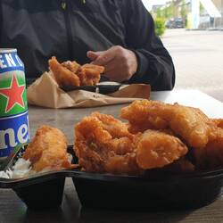 Für heute haben wir uns eine Fahrt mit dem Roller nach Lauwersoog vorgenommen und starten am Vormittag bei herrlichem Sonnenschein. Nur der Nordwind ist immer noch da und das ziemlich frisch. Da wir dem Rollernavi Autobahnen und Schnellstraßen verboten haben,geht die Fahrt wunderschön über kleine Straßen mitten durch die Natur. Es ist, wie bereits gestern mit dem Rad, eine Bilderbuchfahrt. In Anjum an der Windmühle machen wir den ersten Stopp. Normalerweise kann man das Mühlenmuseum besichtigen. Das aber hat Corona bedingt geschlossen. Nebenan das Curiosum hat geöffnet. Aber auf Antiquitäten haben wir grad keine Lust. Wir fahren weiter und kommen an das Sperrwerk und an den Damm, der seit 50 Jahren aus Angst vor Überschwemmungen das Lauwersmeer vom Meer trennt. Dadurch ist ein einmaliges Naturschutzgebiet entstanden. Unser Navi macht das sehr schön, uns lotst uns auf einem kleinen Weg unterhalb der N343 über den Damm. Zwischenzeitlich frage ich mich allerdings, ob wir nicht versehentlich auf dem Radweg gelandet sind. Jedoch die Schilder mit der Geschwindigkeitsbegrenzung auf 60 km sind bestimmt nicht für die Radfahrer gedacht. Gleich hinter dem Damm ist der Anleger für die Fähre nach Schiermonnikoog. Wir fahren auf den Parkplatz des Hafengeländes und spazieren ein wenig am Hafenbecken entlang. Da kommt uns doch glatt jemand mit Kibbelinge entgegen, der nach einem Sitzplatz zum Essen sucht. Bänke gibt es wenig im Hafen und die wenigen sind alle besetzt. Mir geht es nicht so sehr um die Möglickeit zum Sitzen. Mich interessiert viel mehr, die Herkunft der Kibbelinge. Die Spur führt in das verwaist aussehende Hafenrestaurant. Und wirklich der Nächste verlässt mit einem Päckchen, eine mit Uit beschriebene Tür. Wo es ein "Uit " gibt, muss es auch ein "In" geben. Und das finden wir dann rasch. Aber zwischen uns und den Kibbelingen stehen allerdings die Maßnahmen zum Schutz vor Corona, die in einem fremden Land noch undurchsichtiger sind als Zuhause . Zu viele Personen kann es hier nichr geben. Es ist nur eine Person vor uns im Restaurant. Hände desinfizieren. Schild und Flasche sind nicht zu übersehen. Den Fussstapfen ist zu folgen, nehmen wir beim Anblick der gemalten Fußabdrücke auf drm Boden an Und dann ? An welchen der drei Verkaufsstellen sollen wir gehen? Es dauert etwas, bis wir verstehen, das man hier in Bestellen, Bezahlen und Abholen aufgeteilt hat Für das Abholen müssen wir uns in eines der abgeklebten Quadrate stellen. Wie gut, das auch die nachfolgenden Gäste, die des niederländischen mächtig sind, ihre Probleme haben und zurecht gewiesen werden müssen. Die Kibbelinge aber sind den Aufwand wirklich wert. Wir haben selten so leckeren Backfisch gegessen. Nur gut, das wir nur eine Portion gekauft haben. Die Menge ist so riesig, da würde eine ganze Familie von satt. Genüßlich teilen wir sie uns auf einer Bank mit Blick auf den Hafen.