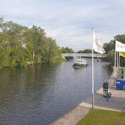 Pfingstwetter vom Feinsten. Noch im Nachthemd sitze ich mit meinem Morgenkaffee in der Hand auf der Wohnmobiltreppe, genieße den schönen Morgen und schaue den Bootsleuten dabei zu, wie sie ihre Boote für einen Ausflug fertig machen. Da gibt es doch immer viel zu schauen. Das meint Michael etwas später auch, als wir beim Frühstück die Tagesaktivitäten überlegen. Er möchte zunächst einmal dem Hafentreiben und dem Schiffsverkehr auf dem Kanal zu schauen. Unserem Logenplatz sei Dank, können wir beides gleichzeitig und haben Sonne rund um die Uhr. Der Wind ist der Preis, den wir für die freie Sicht bezahlen. Aber der hat heute Morgen eine Auszeit genommen.