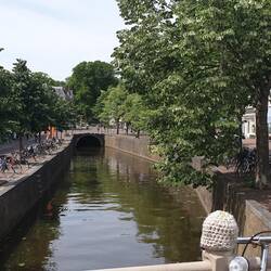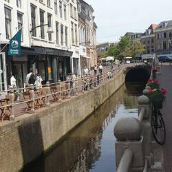 Der Herr an der Mühle gibt uns eine kurze Wegbeschreibung und eine Viertelstunde später erreichen wir auf ausgeschilderten Radwegen Sneek, wo uns als erstes das Wassertor begrüßt . Inzwischen haben wir unseren Knotenpunkt 05 wiedergefunden und durch die etwas wuselige Stadt gelangen wir dann zum Endpunkt der Tour mitten in der Altstadt direkt gegenüber des VVV. Wir stellen die Räder ab und besorgen uns beim VVV einen kostenlosen Stadtplan, anhand dessen wir uns in der Altstadt zu orientieren versuchen. Sneek ist im Gegensatz zu Heeg doch um ein vielfaches größer. Es ist die drittgrößte Stadt in der Provinz Südfriesland und ist aus mehreren Dörfern entstanden. Durch die zentrale Lage im Seengebiet Südfriesland dreht sich auch hier alles um den Wassersport, aber auch viele kleine Läden und Cafes laden zum Bummeln ein. Da es sehr heiß ist, begnügen wir uns mit einem oberflächlichen Bummel durch den Stadtkern und sind dabei auf der Suche nach einem Schattenplatz zum Kaffee trinken. An der Gracht am Grootzan entdecken wir etwas geeignetes. Im Schatten eines Sonnenschirms mit kühlem Windhauch von der Gracht bestellen wir "Koffee verkehrt" und "Appeltart mit Slagroom". Lecker !!! Der "Koffee verkehrt" wird mit einem Gläschen Wasser, frischen Brownies und Karamelsahne serviert. Das Café beschäftigt Menschen mit besonderem Förderbedarf, die uns unter Anleitung Kaffee und Kuchen servieren. Die Niederlande sind uns in Sachen Integration behinderter Menschen doch um einiges voraus.