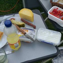 Als ich in den frühen Morgenstunden den Regen auf das Womodach prasseln höre, überlege ich , ob es wohl heute trotzdem die leckeren Brötchen gibt. Marion ist jeden Morgen mit dem Rad zum Bäcker in das 2 km entfernte Frielendorf gefahren und hat für alle Brötchen geholt. "Wahrscheinlich nicht", denke ich und schlafe wieder ein bis mich das Hupen des "Rollenden Supermarktes" aus dem Schlaf reißt, der jeden Morgen gegen 9.00 Uhr auf den Platz fährt. "Himmel!" Dann muss ich heute die Brötchen dort holen und beeile mich, mir etwas anzuziehen. Als ich die Tür aufmache, stolpere ich fast über unsere Brötchen auf der Treppe. Marion sei Dank.
