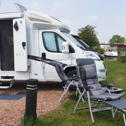 Wir haben richtig Glück und erwischen einen Reihen-Endplatz, auf dem wir weder abkoppeln noch auf die weiße Wand eines Nachbarfahrzeuges blicken müssen. Wunderbar! Und dann kommt auch noch Sonne......was wollen wir für den Moment mehr. Während Michael noch die Begebenheiten des Platzes inspiziert, habe ich schon den ersten Plausch auf Distanz mit Wohnmobilisten aus Cuxhaven. Ob sie vor dem riesen Feiertagsansturm in iher Heimatstadt geflüchtet sind, will ich von ihnen wissen. Ja, es wäre sehr, sehr voll gewesen, erzählen sie.