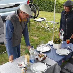 Am Abend beim gemeinsamen Grillen erwischt es uns dann doch noch, und das, obwohl Wetter-Online nichts davon vorausgesagt hat, es fängt an zu regnen. Zwischen Vorspeise und Hauptgericht müssen wir eine unfreiwillige Essenspause im Mobil einlegen. Aber es ist nur ein Schauer, so dass es wenig später weitergehen kann. So recht gemütlich aber will es draußen nicht mehr werden. Der kalte Wind ......und so lässt jeder für sich den