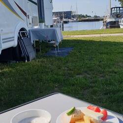 Was gibt es Schöneres als morgens nach dem Aufwachen aus dem Wohnmobilfenster zu schauen und auf kleine Boote im Hafen zu blicken, die unter einem strahlend blauen Himmel im Wasser vor sich hin dümpeln, während auf dem Kanal nebenan bereits die ersten Schiffe unterwegs sind? Urlaubsfeeling vom Feinsten. Dieser Platz ist wirklich wunderschön, stellen wir mal wieder beim Frühstück fest, während wir den Tag planen.
