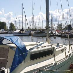 Dann erreicht uns eine Whatsapp-Nachricht von unseren Freunden:" Wir sind bereits da und müssen auf den Hafenmeister warten, der uns den Platz zuweist. Es ist sehr voll." Ok! Wir sind allerdings noch gut 100 km entfernt. Aber auch die vergehen schnell. Wir erreichen das hübsche Randgebiet von Sneek. Wenig später weist uns das Navi in die sehr kleine Straße der Fußgängerzone und in eine die noch schmalere Seitenstraße über eine Brücke zum Hafen von Heeg. Das Wohnmobil unserer Freunde können wir hinter einem Tor sehen. Wir parken das Mobil auf dem Besucherparkplatz des Hafens, und ich mache mich auf die Suche nach dem Hafenmeister. Wenig später schließt er uns das Tor zum Hafengelände auf und fährt einen Poller herunter. Trotzdem muss Michael rückwärts durch die schmale Zufahrt zwischen Hafenbecken und Servicehaus fahren. Gut, dass wir dieses Mal den Hänger nicht mitgenommen haben, weil wir die "Rote Paula", unsere Vespa, bei dieser Fahrt nicht brauchen. Als Belohnung für diese etwas schwierige Anfahrt stehen wir danach in Alleinlage direkt am Hafenbecken.